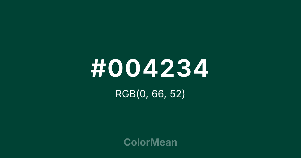 #004234 RGB value is (0, 66, 52). The hex color red value is 0, green is 66, and blue is 52. Its HSL format shows a hue of 167°, saturation of 100 percent, and lightness of 13 percent. The CMYK process values are 100 percent, 0 percent, 21 percent, 74 percent.