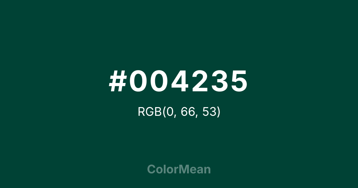 #004235 RGB value is (0, 66, 53). The hex color red value is 0, green is 66, and blue is 53. Its HSL format shows a hue of 168°, saturation of 100 percent, and lightness of 13 percent. The CMYK process values are 100 percent, 0 percent, 20 percent, 74 percent.