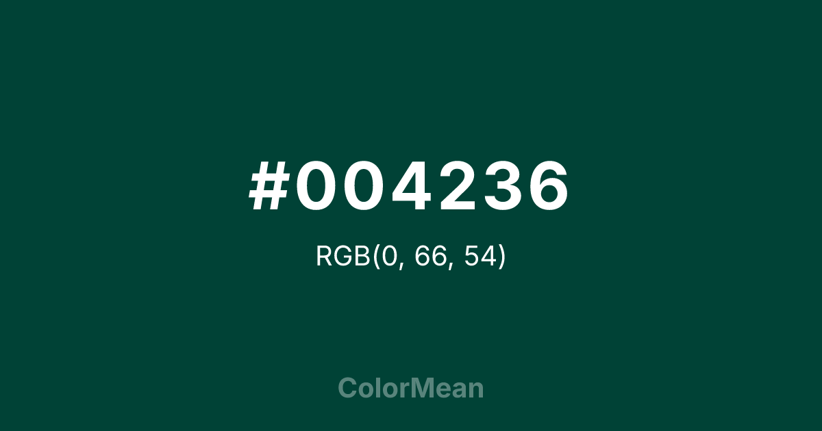 #004236 RGB value is (0, 66, 54). The hex color red value is 0, green is 66, and blue is 54. Its HSL format shows a hue of 169°, saturation of 100 percent, and lightness of 13 percent. The CMYK process values are 100 percent, 0 percent, 18 percent, 74 percent.