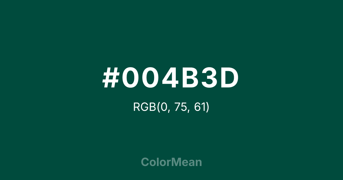 #004B3D RGB value is (0, 75, 61). The hex color red value is 0, green is 75, and blue is 61. Its HSL format shows a hue of 169°, saturation of 100 percent, and lightness of 15 percent. The CMYK process values are 100 percent, 0 percent, 19 percent, 71 percent.