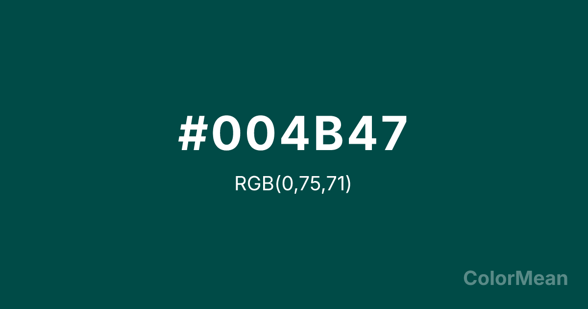 #004B47 RGB value is (0, 75, 71). The hex color red value is 0, green is 75, and blue is 71. Its HSL format shows a hue of 177°, saturation of 100 percent, and lightness of 15 percent. The CMYK process values are 100 percent, 0 percent, 5 percent, 71 percent.
