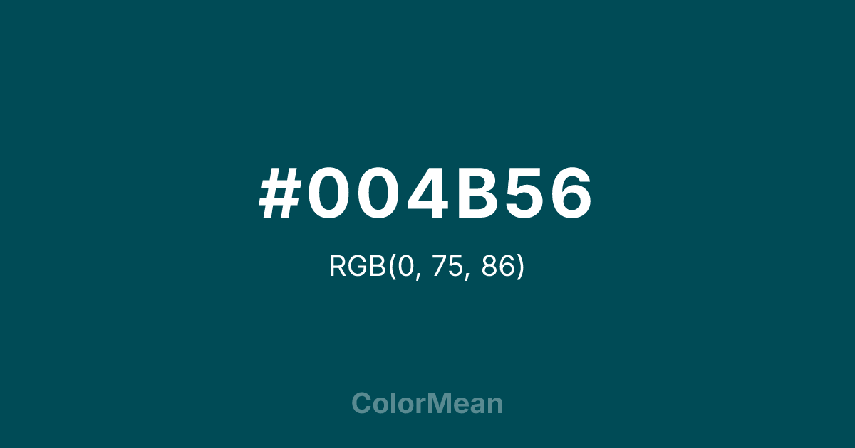 #004B56 RGB value is (0, 75, 86). The hex color red value is 0, green is 75, and blue is 86. Its HSL format shows a hue of 188°, saturation of 100 percent, and lightness of 17 percent. The CMYK process values are 100 percent, 13 percent, 0 percent, 66 percent.