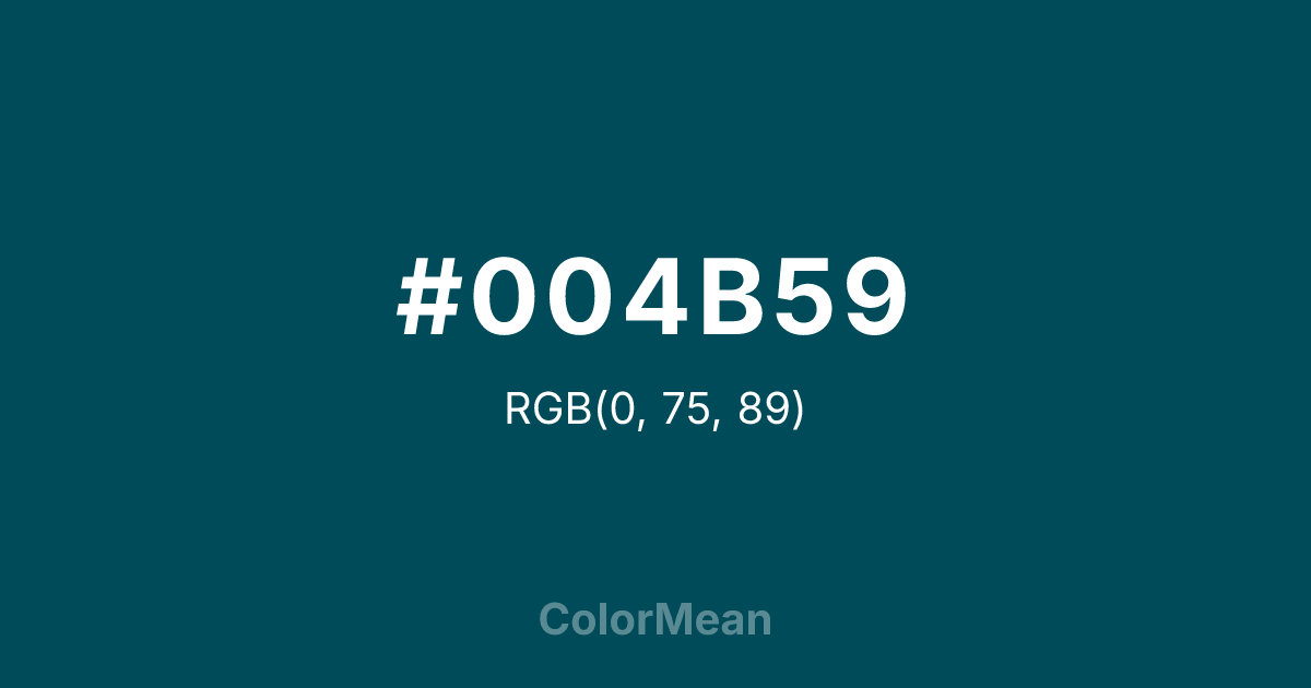 #004B59 RGB value is (0, 75, 89). The hex color red value is 0, green is 75, and blue is 89. Its HSL format shows a hue of 189°, saturation of 100 percent, and lightness of 17 percent. The CMYK process values are 100 percent, 16 percent, 0 percent, 65 percent.
