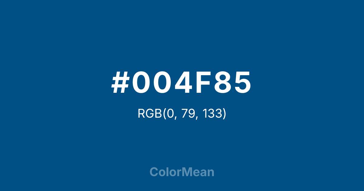 #004F85 RGB value is (0, 79, 133). The hex color red value is 0, green is 79, and blue is 133. Its HSL format shows a hue of 204°, saturation of 100 percent, and lightness of 26 percent. The CMYK process values are 100 percent, 41 percent, 0 percent, 48 percent.