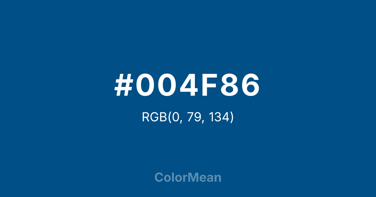 #004F86 RGB value is (0, 79, 134). The hex color red value is 0, green is 79, and blue is 134. Its HSL format shows a hue of 205°, saturation of 100 percent, and lightness of 26 percent. The CMYK process values are 100 percent, 41 percent, 0 percent, 47 percent.