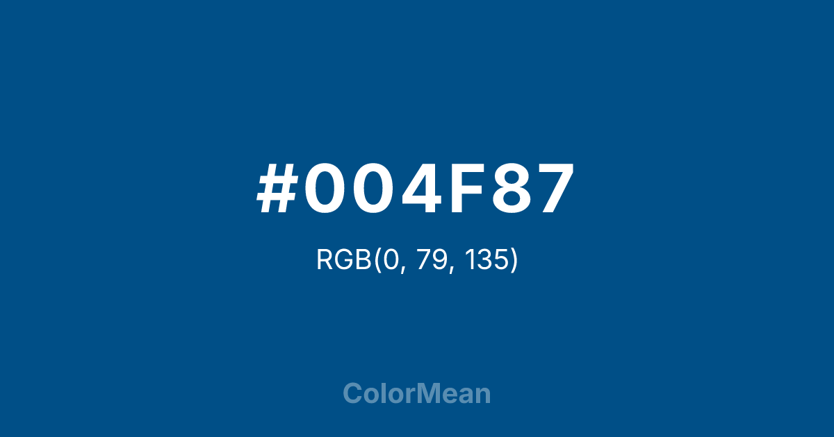 #004F87 RGB value is (0, 79, 135). The hex color red value is 0, green is 79, and blue is 135. Its HSL format shows a hue of 205°, saturation of 100 percent, and lightness of 26 percent. The CMYK process values are 100 percent, 41 percent, 0 percent, 47 percent.