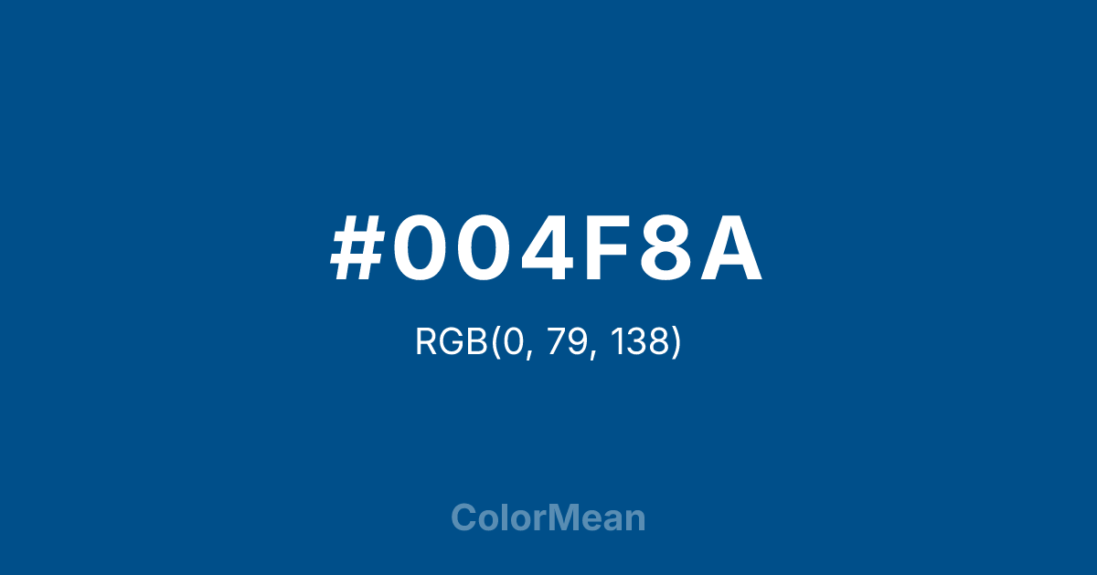 #004F8A RGB value is (0, 79, 138). The hex color red value is 0, green is 79, and blue is 138. Its HSL format shows a hue of 206°, saturation of 100 percent, and lightness of 27 percent. The CMYK process values are 100 percent, 43 percent, 0 percent, 46 percent.