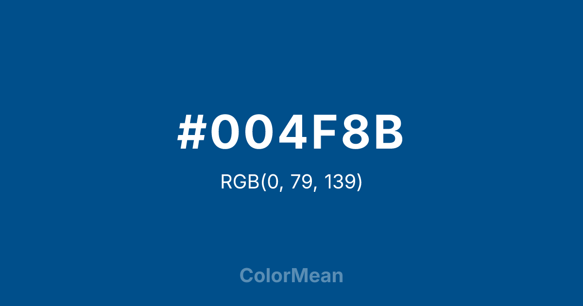 #004F8B RGB value is (0, 79, 139). The hex color red value is 0, green is 79, and blue is 139. Its HSL format shows a hue of 206°, saturation of 100 percent, and lightness of 27 percent. The CMYK process values are 100 percent, 43 percent, 0 percent, 45 percent.