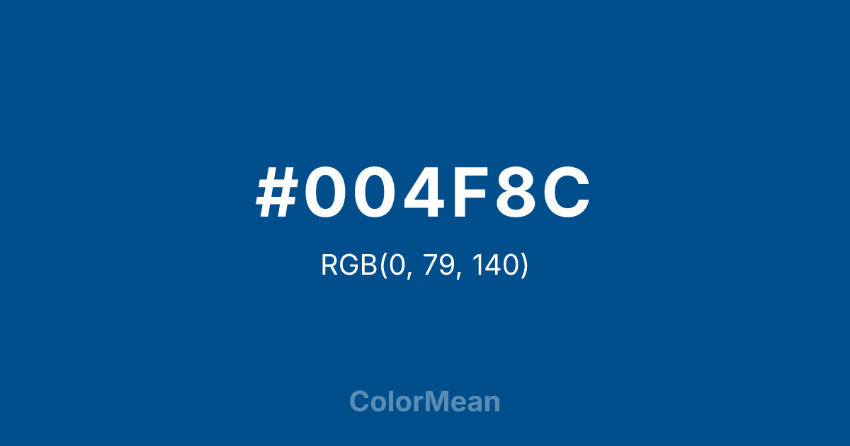 #004F8C RGB value is (0, 79, 140). The hex color red value is 0, green is 79, and blue is 140. Its HSL format shows a hue of 206°, saturation of 100 percent, and lightness of 27 percent. The CMYK process values are 100 percent, 44 percent, 0 percent, 45 percent.