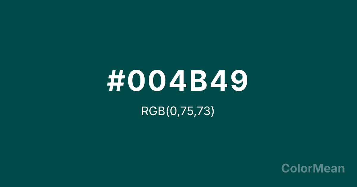 Deep Jungle Green (#004B49) RGB value is (0, 75, 73). The hex color red value is 0, green is 75, and blue is 73. Its HSL format shows a hue of 178°, saturation of 100 percent, and lightness of 15 percent. The CMYK process values are 100 percent, 0 percent, 3 percent, 71 percent.