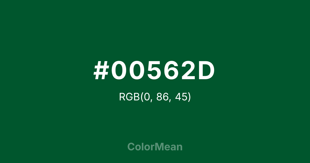 #00562D RGB value is (0, 86, 45). The hex color red value is 0, green is 86, and blue is 45. Its HSL format shows a hue of 151°, saturation of 100 percent, and lightness of 17 percent. The CMYK process values are 100 percent, 0 percent, 48 percent, 66 percent.
