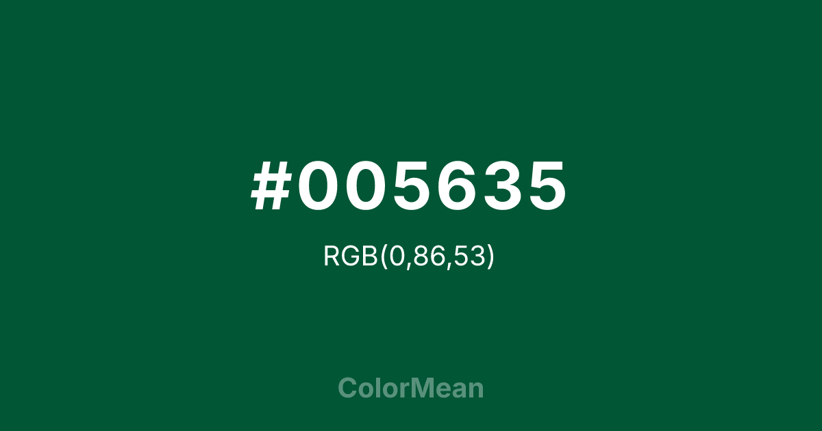 #005635 RGB value is (0, 86, 53). The hex color red value is 0, green is 86, and blue is 53. Its HSL format shows a hue of 157°, saturation of 100 percent, and lightness of 17 percent. The CMYK process values are 100 percent, 0 percent, 38 percent, 66 percent.