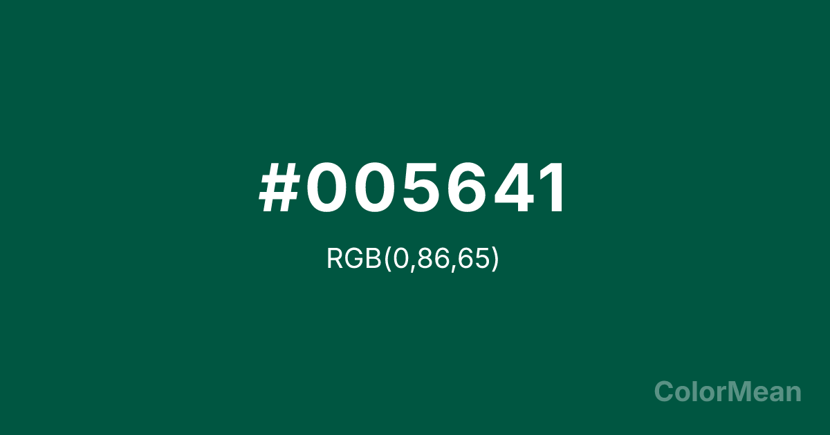 #005641 RGB value is (0, 86, 65). The hex color red value is 0, green is 86, and blue is 65. Its HSL format shows a hue of 165°, saturation of 100 percent, and lightness of 17 percent. The CMYK process values are 100 percent, 0 percent, 24 percent, 66 percent.