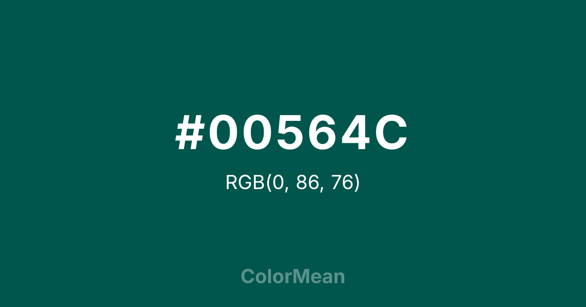 #00564C RGB value is (0, 86, 76). The hex color red value is 0, green is 86, and blue is 76. Its HSL format shows a hue of 173°, saturation of 100 percent, and lightness of 17 percent. The CMYK process values are 100 percent, 0 percent, 12 percent, 66 percent.