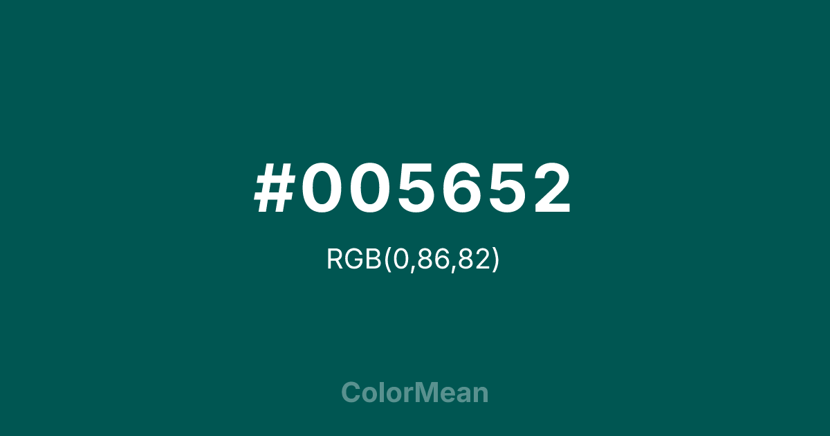 #005652 RGB value is (0, 86, 82). The hex color red value is 0, green is 86, and blue is 82. Its HSL format shows a hue of 177°, saturation of 100 percent, and lightness of 17 percent. The CMYK process values are 100 percent, 0 percent, 5 percent, 66 percent.