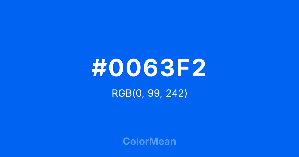 #0063F2 RGB value is (0, 99, 242). The hex color red value is 0, green is 99, and blue is 242. Its HSL format shows a hue of 215°, saturation of 100 percent, and lightness of 47 percent. The CMYK process values are 100 percent, 59 percent, 0 percent, 5 percent.