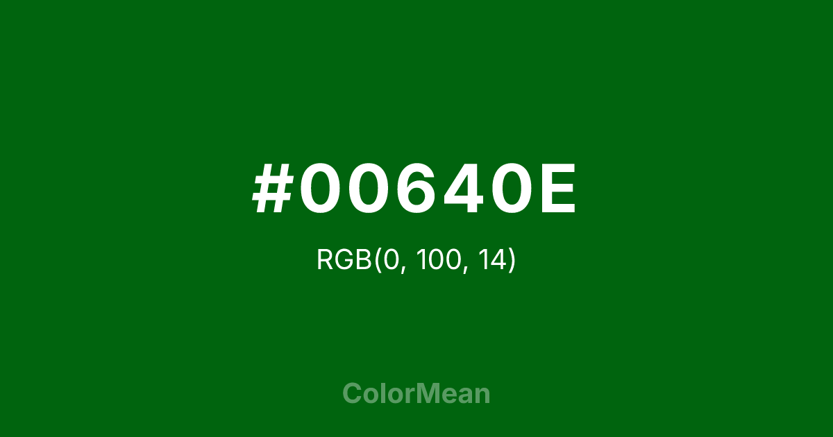 #00640E RGB value is (0, 100, 14). The hex color red value is 0, green is 100, and blue is 14. Its HSL format shows a hue of 128°, saturation of 100 percent, and lightness of 20 percent. The CMYK process values are 100 percent, 0 percent, 86 percent, 61 percent.