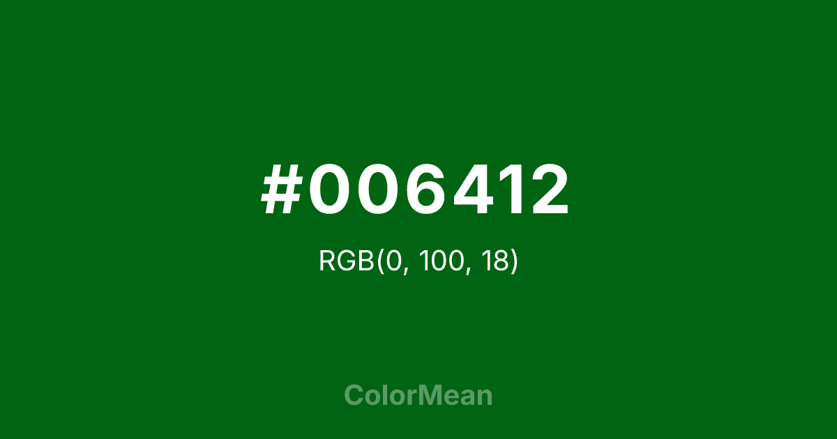 #006412 RGB value is (0, 100, 18). The hex color red value is 0, green is 100, and blue is 18. Its HSL format shows a hue of 131°, saturation of 100 percent, and lightness of 20 percent. The CMYK process values are 100 percent, 0 percent, 82 percent, 61 percent.