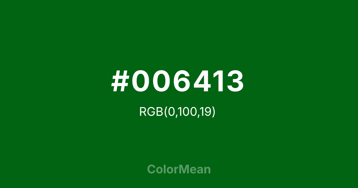 #006413 RGB value is (0, 100, 19). The hex color red value is 0, green is 100, and blue is 19. Its HSL format shows a hue of 131°, saturation of 100 percent, and lightness of 20 percent. The CMYK process values are 100 percent, 0 percent, 81 percent, 61 percent.