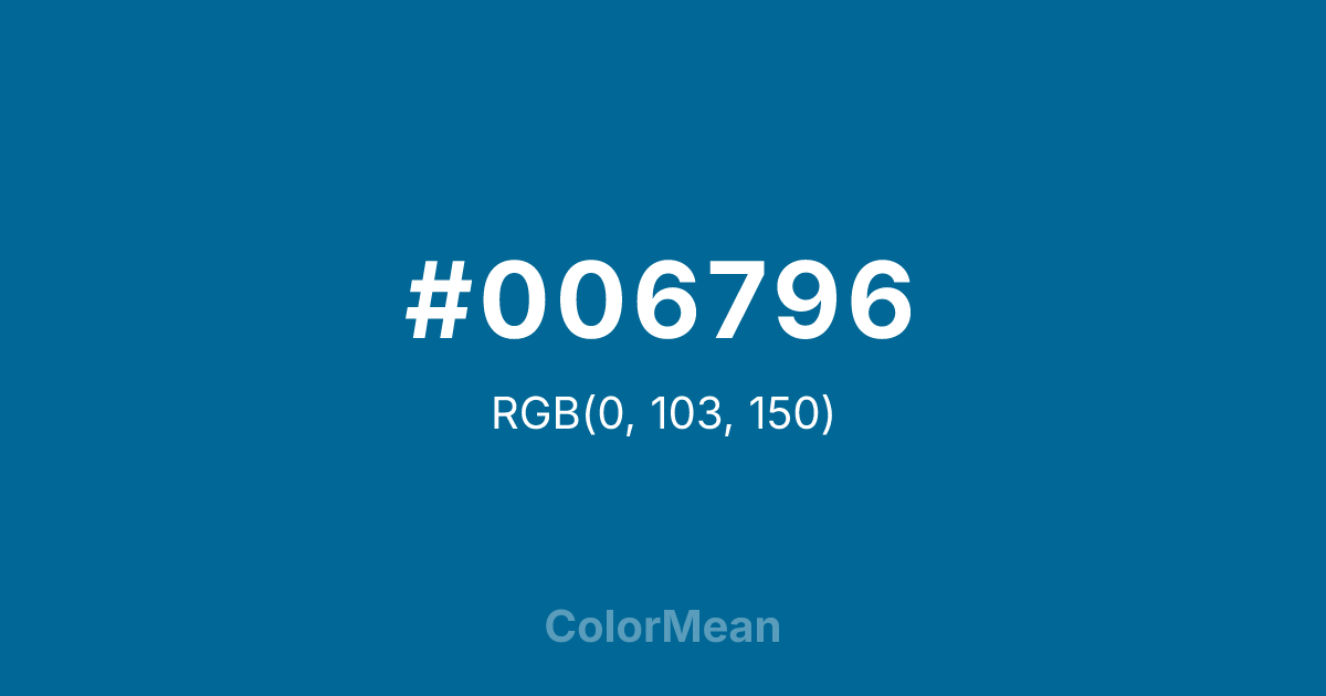 #006796 RGB value is (0, 103, 150). The hex color red value is 0, green is 103, and blue is 150. Its HSL format shows a hue of 199°, saturation of 100 percent, and lightness of 29 percent. The CMYK process values are 100 percent, 31 percent, 0 percent, 41 percent.