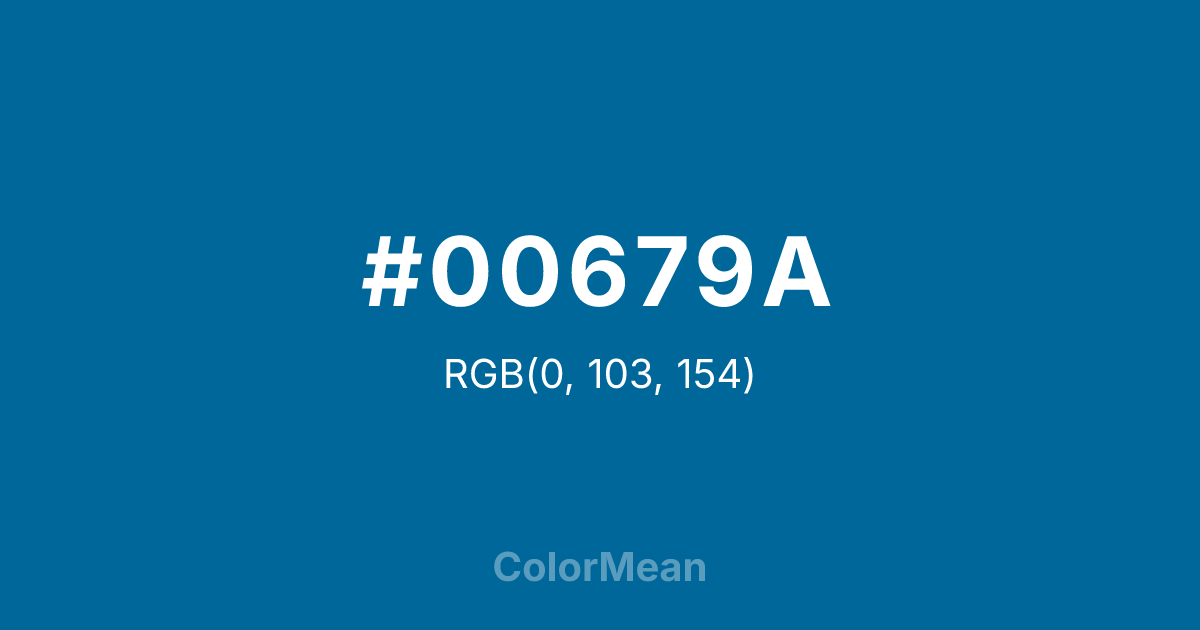 #00679A RGB value is (0, 103, 154). The hex color red value is 0, green is 103, and blue is 154. Its HSL format shows a hue of 200°, saturation of 100 percent, and lightness of 30 percent. The CMYK process values are 100 percent, 33 percent, 0 percent, 40 percent.