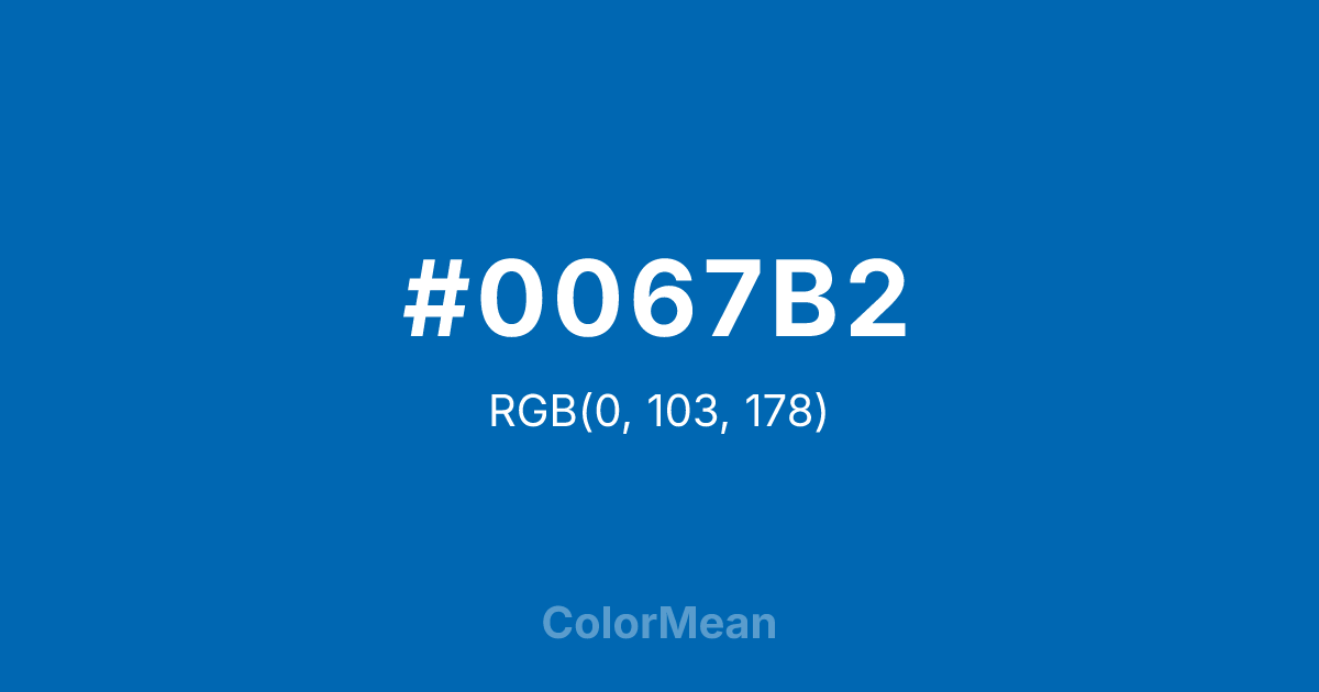 #0067B2 RGB value is (0, 103, 178). The hex color red value is 0, green is 103, and blue is 178. Its HSL format shows a hue of 205°, saturation of 100 percent, and lightness of 35 percent. The CMYK process values are 100 percent, 42 percent, 0 percent, 30 percent.