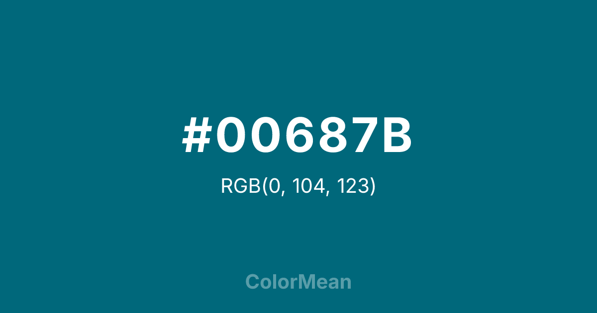 #00687B RGB value is (0, 104, 123). The hex color red value is 0, green is 104, and blue is 123. Its HSL format shows a hue of 189°, saturation of 100 percent, and lightness of 24 percent. The CMYK process values are 100 percent, 15 percent, 0 percent, 52 percent.