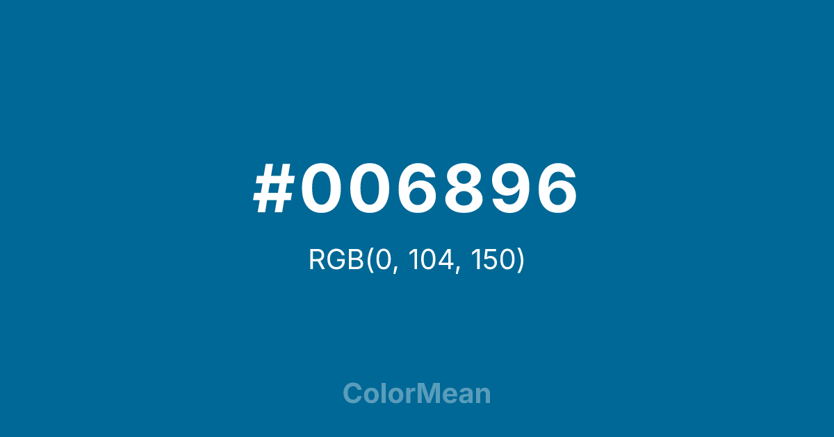 #006896 RGB value is (0, 104, 150). The hex color red value is 0, green is 104, and blue is 150. Its HSL format shows a hue of 198°, saturation of 100 percent, and lightness of 29 percent. The CMYK process values are 100 percent, 31 percent, 0 percent, 41 percent.