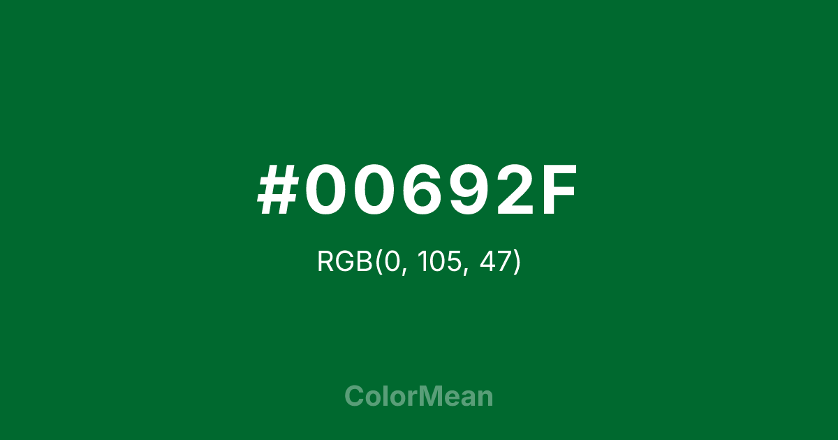 #00692F RGB value is (0, 105, 47). The hex color red value is 0, green is 105, and blue is 47. Its HSL format shows a hue of 147°, saturation of 100 percent, and lightness of 21 percent. The CMYK process values are 100 percent, 0 percent, 55 percent, 59 percent.