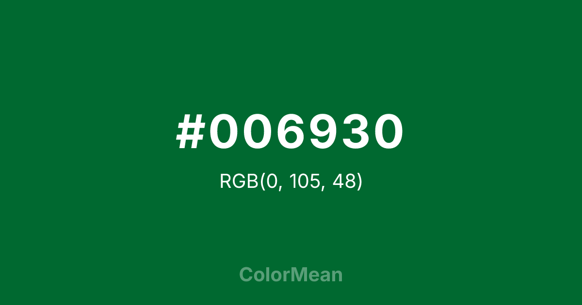 #006930 RGB value is (0, 105, 48). The hex color red value is 0, green is 105, and blue is 48. Its HSL format shows a hue of 147°, saturation of 100 percent, and lightness of 21 percent. The CMYK process values are 100 percent, 0 percent, 54 percent, 59 percent.