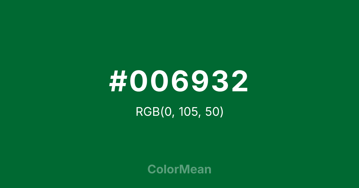 #006932 RGB value is (0, 105, 50). The hex color red value is 0, green is 105, and blue is 50. Its HSL format shows a hue of 149°, saturation of 100 percent, and lightness of 21 percent. The CMYK process values are 100 percent, 0 percent, 52 percent, 59 percent.