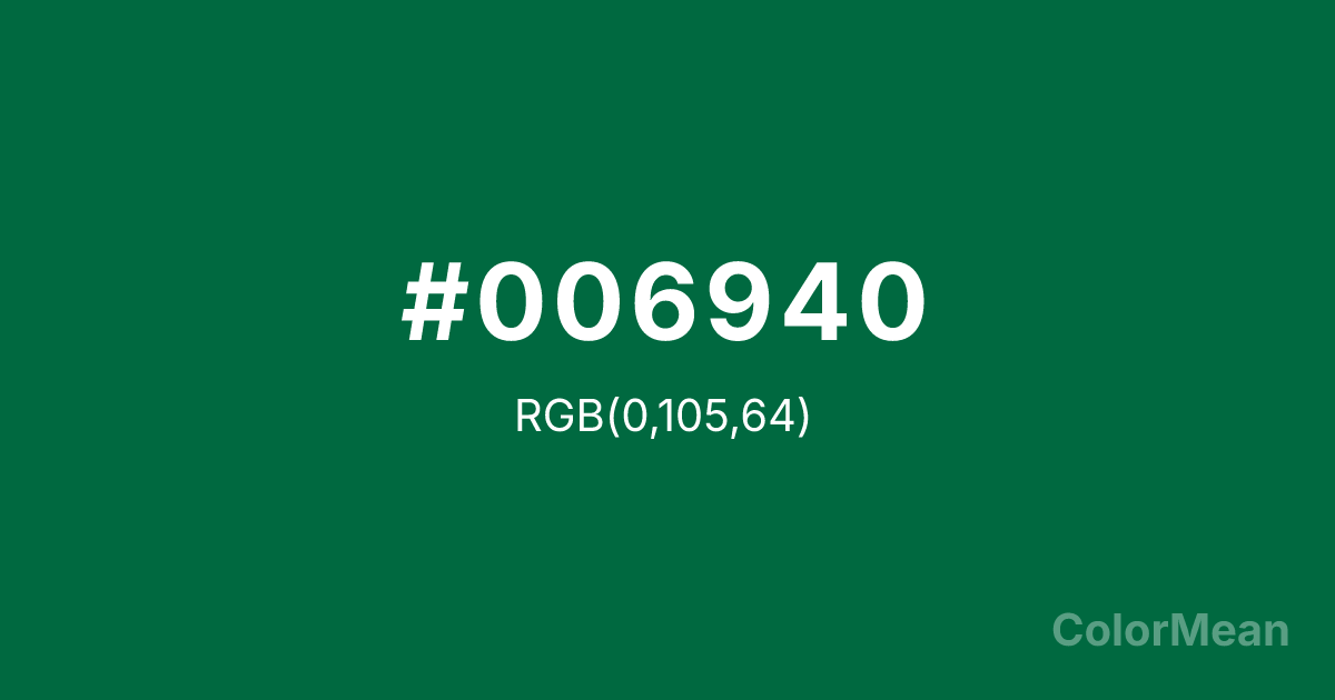 #006940 RGB value is (0, 105, 64). The hex color red value is 0, green is 105, and blue is 64. Its HSL format shows a hue of 157°, saturation of 100 percent, and lightness of 21 percent. The CMYK process values are 100 percent, 0 percent, 39 percent, 59 percent.