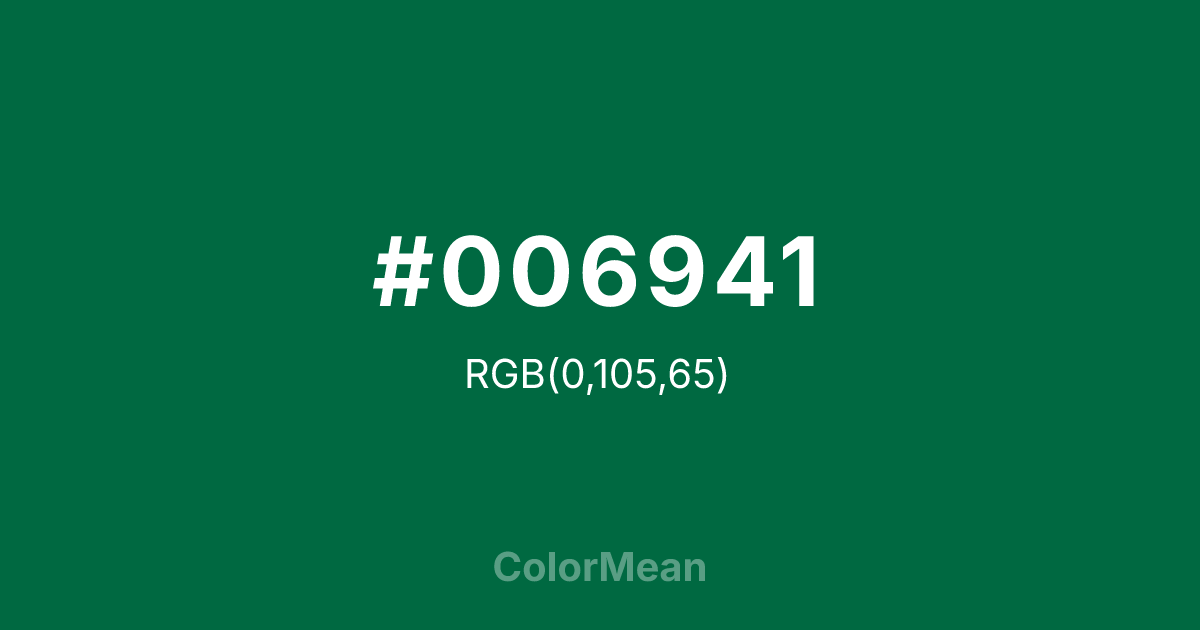 #006941 RGB value is (0, 105, 65). The hex color red value is 0, green is 105, and blue is 65. Its HSL format shows a hue of 157°, saturation of 100 percent, and lightness of 21 percent. The CMYK process values are 100 percent, 0 percent, 38 percent, 59 percent.