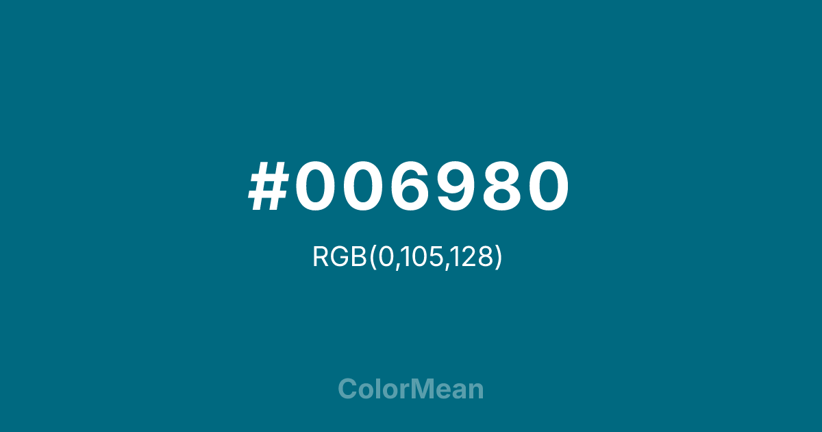 #006980 RGB value is (0, 105, 128). The hex color red value is 0, green is 105, and blue is 128. Its HSL format shows a hue of 191°, saturation of 100 percent, and lightness of 25 percent. The CMYK process values are 100 percent, 18 percent, 0 percent, 50 percent.