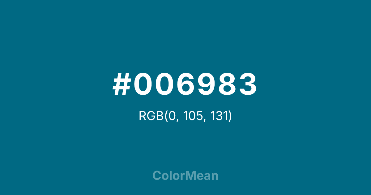 #006983 RGB value is (0, 105, 131). The hex color red value is 0, green is 105, and blue is 131. Its HSL format shows a hue of 192°, saturation of 100 percent, and lightness of 26 percent. The CMYK process values are 100 percent, 20 percent, 0 percent, 49 percent.
