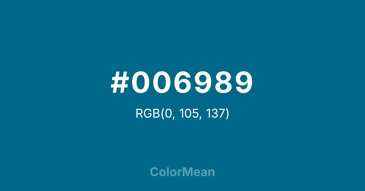 #006989 RGB value is (0, 105, 137). The hex color red value is 0, green is 105, and blue is 137. Its HSL format shows a hue of 194°, saturation of 100 percent, and lightness of 27 percent. The CMYK process values are 100 percent, 23 percent, 0 percent, 46 percent.