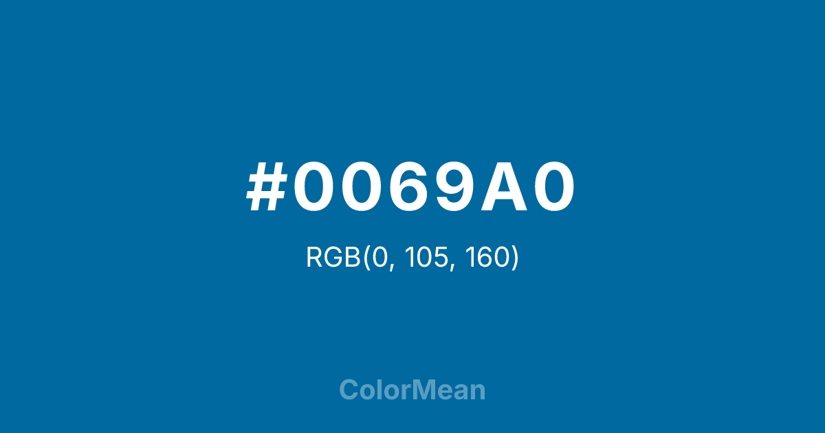 #0069A0 RGB value is (0, 105, 160). The hex color red value is 0, green is 105, and blue is 160. Its HSL format shows a hue of 201°, saturation of 100 percent, and lightness of 31 percent. The CMYK process values are 100 percent, 34 percent, 0 percent, 37 percent.