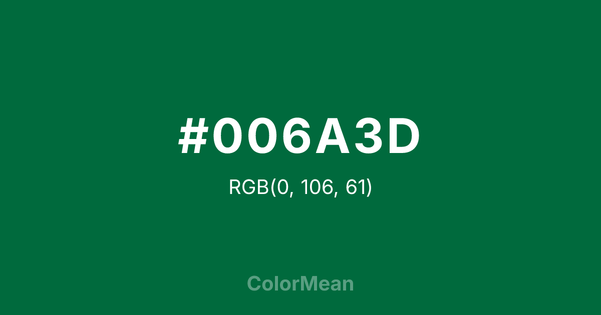 #006A3D RGB value is (0, 106, 61). The hex color red value is 0, green is 106, and blue is 61. Its HSL format shows a hue of 155°, saturation of 100 percent, and lightness of 21 percent. The CMYK process values are 100 percent, 0 percent, 42 percent, 58 percent.