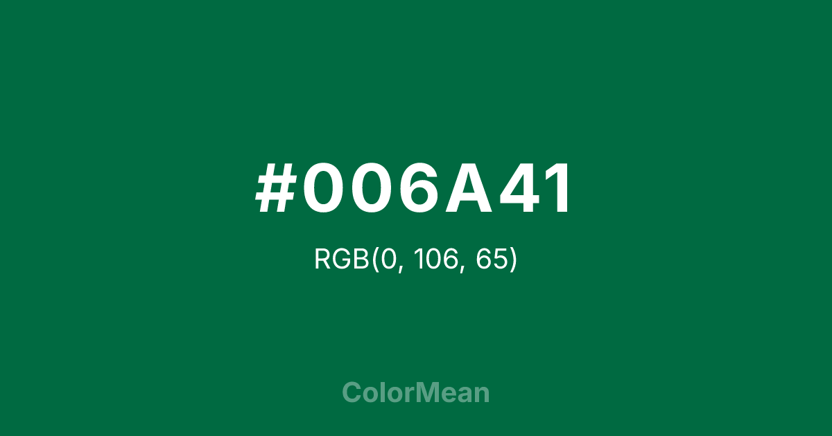 #006A41 RGB value is (0, 106, 65). The hex color red value is 0, green is 106, and blue is 65. Its HSL format shows a hue of 157°, saturation of 100 percent, and lightness of 21 percent. The CMYK process values are 100 percent, 0 percent, 39 percent, 58 percent.