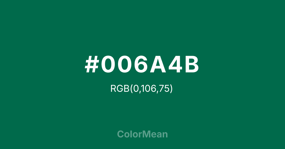 #006A4B RGB value is (0, 106, 75). The hex color red value is 0, green is 106, and blue is 75. Its HSL format shows a hue of 162°, saturation of 100 percent, and lightness of 21 percent. The CMYK process values are 100 percent, 0 percent, 29 percent, 58 percent.