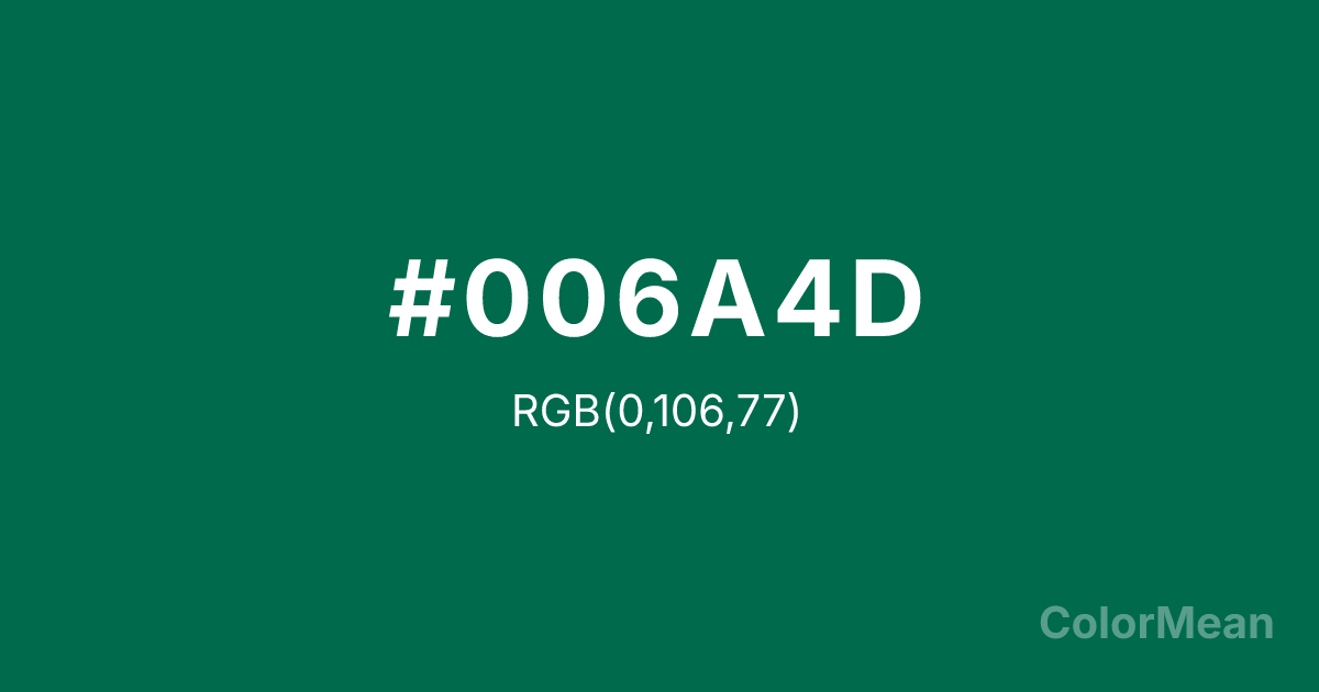 #006A4D RGB value is (0, 106, 77). The hex color red value is 0, green is 106, and blue is 77. Its HSL format shows a hue of 164°, saturation of 100 percent, and lightness of 21 percent. The CMYK process values are 100 percent, 0 percent, 27 percent, 58 percent.