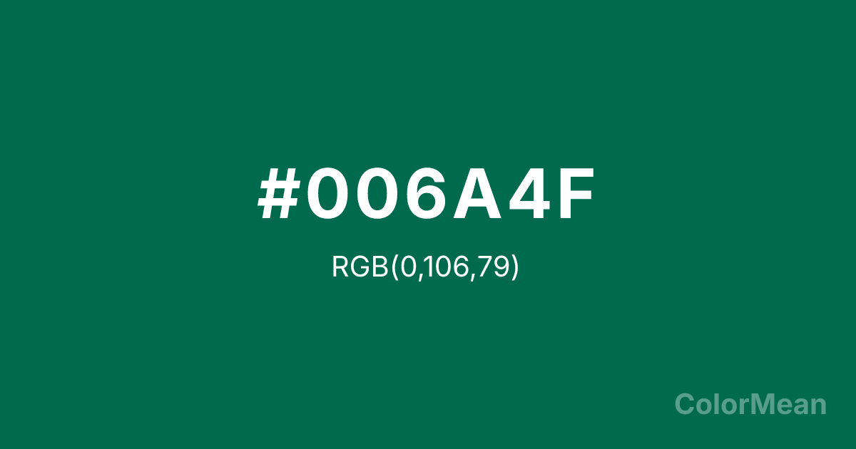 #006A4F RGB value is (0, 106, 79). The hex color red value is 0, green is 106, and blue is 79. Its HSL format shows a hue of 165°, saturation of 100 percent, and lightness of 21 percent. The CMYK process values are 100 percent, 0 percent, 25 percent, 58 percent.