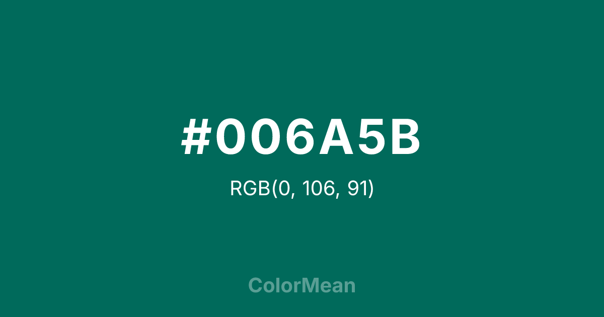 #006A5B RGB value is (0, 106, 91). The hex color red value is 0, green is 106, and blue is 91. Its HSL format shows a hue of 172°, saturation of 100 percent, and lightness of 21 percent. The CMYK process values are 100 percent, 0 percent, 14 percent, 58 percent.