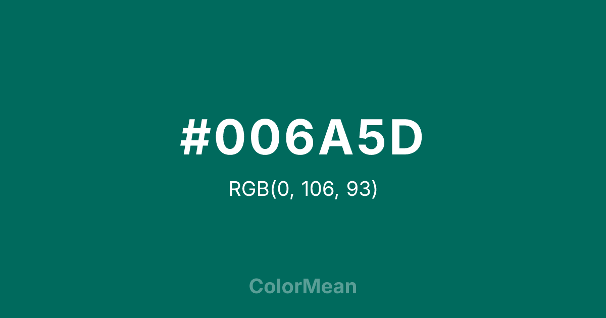#006A5D RGB value is (0, 106, 93). The hex color red value is 0, green is 106, and blue is 93. Its HSL format shows a hue of 173°, saturation of 100 percent, and lightness of 21 percent. The CMYK process values are 100 percent, 0 percent, 12 percent, 58 percent.