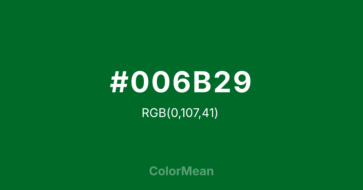 #006B29 RGB value is (0, 107, 41). The hex color red value is 0, green is 107, and blue is 41. Its HSL format shows a hue of 143°, saturation of 100 percent, and lightness of 21 percent. The CMYK process values are 100 percent, 0 percent, 62 percent, 58 percent.