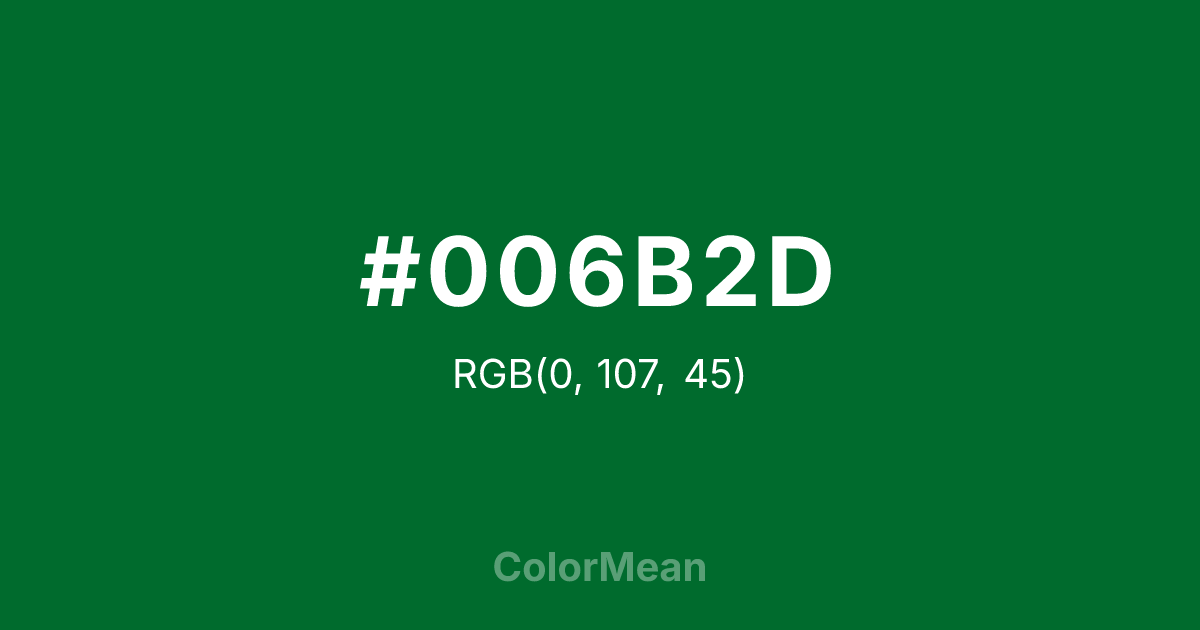 #006B2D RGB value is (0, 107, 45). The hex color red value is 0, green is 107, and blue is 45. Its HSL format shows a hue of 145°, saturation of 100 percent, and lightness of 21 percent. The CMYK process values are 100 percent, 0 percent, 58 percent, 58 percent.