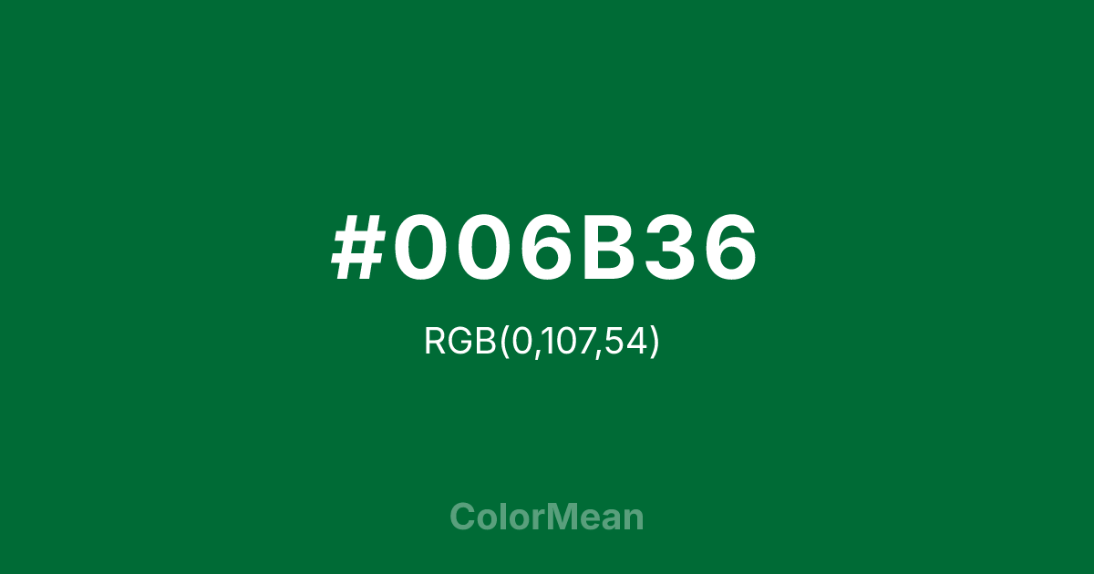 #006B36 RGB value is (0, 107, 54). The hex color red value is 0, green is 107, and blue is 54. Its HSL format shows a hue of 150°, saturation of 100 percent, and lightness of 21 percent. The CMYK process values are 100 percent, 0 percent, 50 percent, 58 percent.