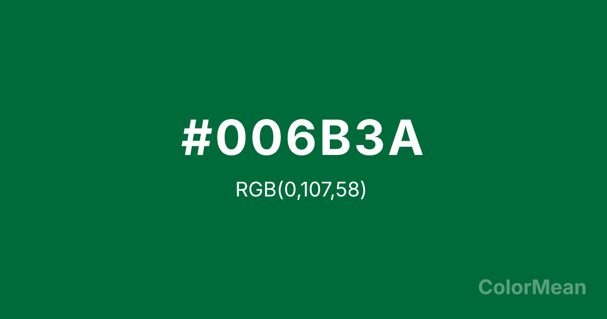 #006B3A RGB value is (0, 107, 58). The hex color red value is 0, green is 107, and blue is 58. Its HSL format shows a hue of 153°, saturation of 100 percent, and lightness of 21 percent. The CMYK process values are 100 percent, 0 percent, 46 percent, 58 percent.
