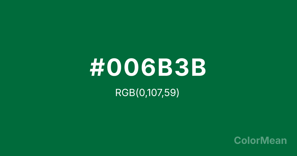 #006B3B RGB value is (0, 107, 59). The hex color red value is 0, green is 107, and blue is 59. Its HSL format shows a hue of 153°, saturation of 100 percent, and lightness of 21 percent. The CMYK process values are 100 percent, 0 percent, 45 percent, 58 percent.