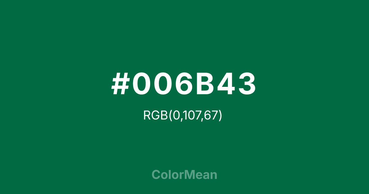 #006B43 RGB value is (0, 107, 67). The hex color red value is 0, green is 107, and blue is 67. Its HSL format shows a hue of 158°, saturation of 100 percent, and lightness of 21 percent. The CMYK process values are 100 percent, 0 percent, 37 percent, 58 percent.